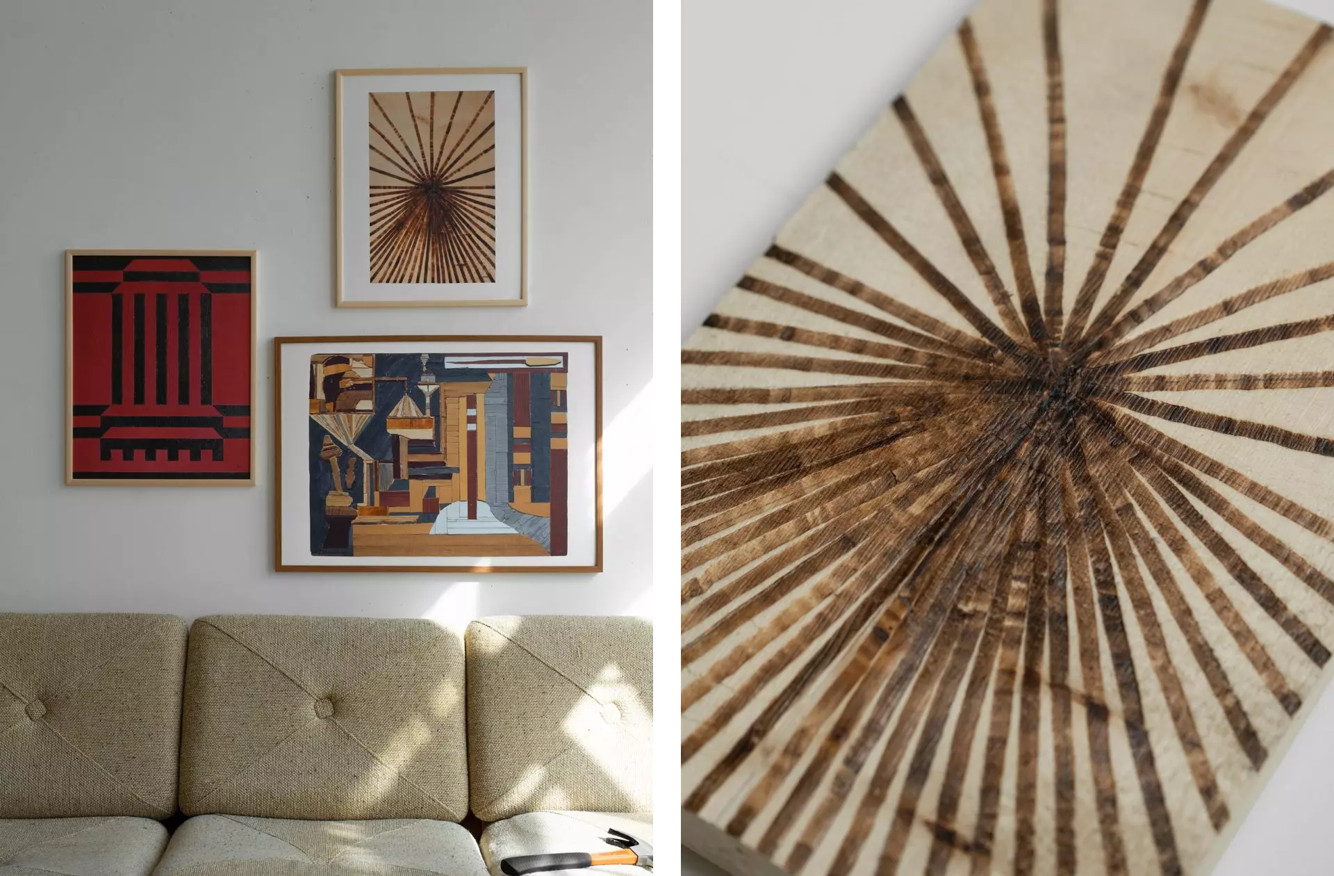 A: Mestadels trä och att prova olika tekniker med det, men egentligen allt som jag kan få tag på och som verkar intressant. I början av en process brukar jag vända mig till den stora högen med träskrot som jag har i ett av hörnen i min studio. Ofta skär jag upp massor av kuber och former som jag sedan limmar fast på en större struktur eller en plan yta, ungefär som mosaik fast med trä. Med tiden har den högen vuxit och innehåller en hel del rester och trasiga bitar från tidigare arbeten. När jag till exempel sågar ut en form slänger jag de bitar som jag inte kommer att använda, och senare kan jag återanvända de negativa formerna som jag inte var medveten om att jag gjorde i första hand. Det tar mina verk i riktningar som jag inte planerat för, vilket är trevligt eftersom det är väldigt lätt att fastna i sina egna sätt ibland.
