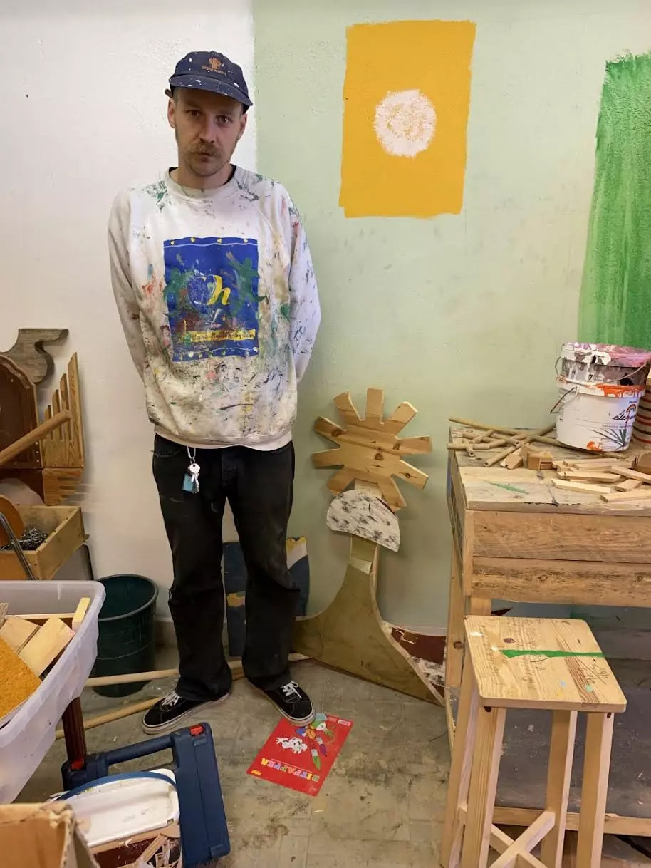 A: De flesta av de material jag använder hittar jag på gatorna, i soprum och containrar. Jag hamstrar material och staplar det i min studio. På senare tid har jag samlat drivved och glasbitar från stranden, jag vet inte vad jag ska göra av det än men jag får idéer medan jag arbetar och gör snabba skisser så att jag kan gå från en sak till en annan och hålla saker och ting i rörelse. Jag brukar ha två eller tre arbeten på gång samtidigt, på så sätt kan jag hoppa direkt till något annat om jag tröttnar på det jag håller på med för tillfället. Jag arbetar i min ateljé med alla trärelaterade saker och det mesta av måleriet som jag gör, det är trevligt att kunna kasta runt saker och göra en röra medan man räknar ut saker. Hemma gör jag broderier, teckningar och annat som inte är lika rörigt, jag gillar att röra mig mellan dessa lägen. Jag älskar också att arbeta utomhus.