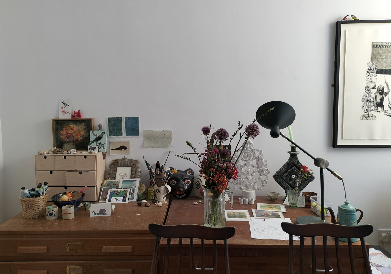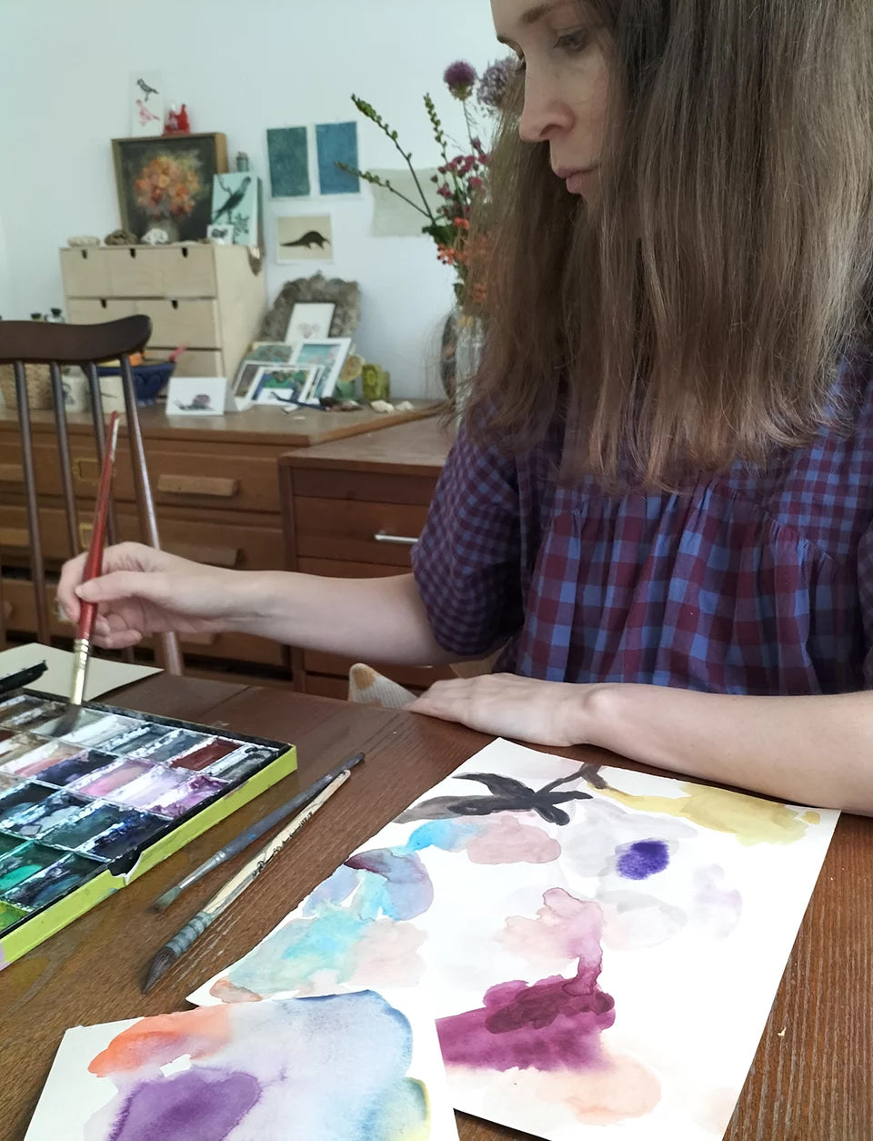 A: Like many people, I started painting during my childhood, but like many people, I stopped when I left school. It wasn't until I was in my early 30s that I started painting and drawing again. This happened when I was on maternity leave with my daughter. I can't say exactly why, but maybe because time took on a different quality or because life/routine was interrupted in some way. I don't think my interest in art ever really left me, but the compulsion to make something myself took a break until that point. However, once I started, I was hooked, and it is now a really important part of my life and identity.