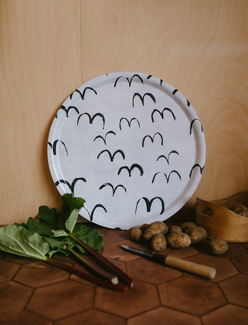 Roomy round tray in laminated birch wood with the pattern Bird by Elisabeth Dunker. Serve your favorite breakfast on it or use it in the kitchen for your herbs and oils. A piece of art in itself! \n \nOur trays are FSC-marked which ensures that all registered forest plantations only cut down trees according to very strict norms and regulations. Also the rights of the local inhabitants and forest workers are respected. When you choose a FSC marked product you show that you care for our nature and environment, just as we do. Thank you! \n \nDesign Elisabeth Dunker, Fine Little Day \nSize Ø 38 cm / Ø 15 in \nMaterial Laminated birch \nColor White/black \nCare Dishwasher safe up to 95°C \nMade in Sweden \nOther Food contact approved (EU)