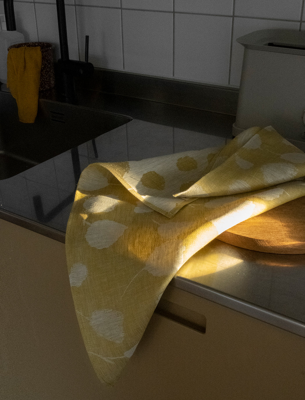 The pattern Bouquet by Isis Maakestad on woven linen in a collection consisting of kitchen linen and fabric by the meter. Squared kitchen towel in pure linen. The linens power of absorption and durable fibers makes it perfect for the kitchen. The textile is jacquard woven and inverts the color so each side looks different. \n \nDesign Isis Maakestad for Fine Little Day \nSize 58x58 cm / 22.8x22.8 in \nTechnique Jacquard woven \nMaterial 100% linen, 207 gsm \nColor Yellow/off-white \nCare Machine wash 40°C \nMade in EU \nOther Shrinkage 6%