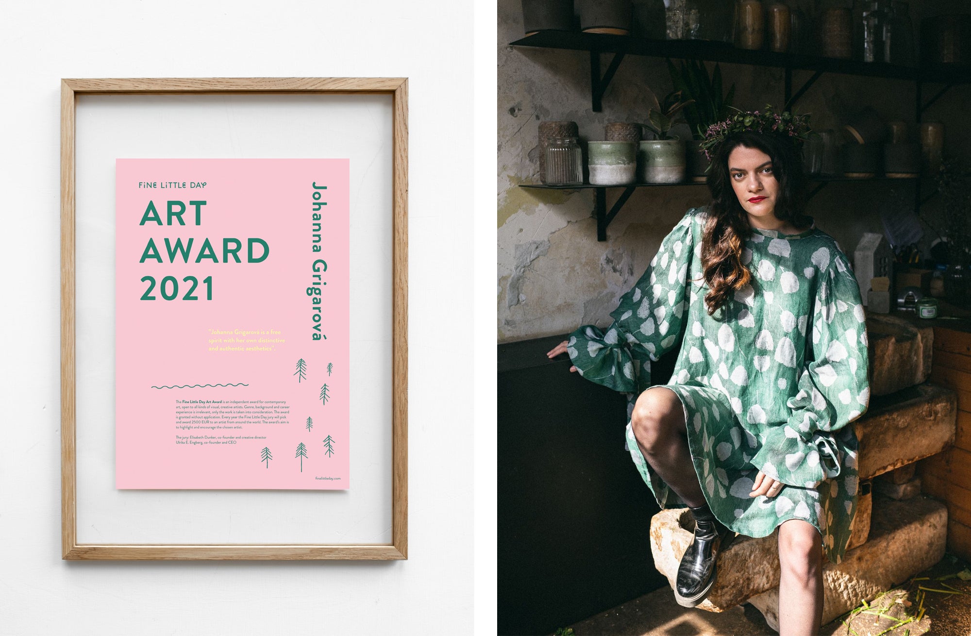"Johanna Grigarová är en fri själ med en egen distinkt och autentisk estetik. Johanna är modetextildesigner med en kandidatexamen i textildesign(2017) och en masterexamen i modedesign(2019) från Akademin för konst och design i Bratislava, Slovakien. Dessutom har hon en kandidatexamen i socialt arbete. Grigarovás verk förskönar och förhöjer textilier på ett direkt och sensuellt sätt. De skickligt skapade kreationerna och de visuellt omgivande sammanhangen är ofta vilda och innehåller narrativa element med nästan mystiska egenskaper. Vi hyllar Grigarovás arbete och har utsett henne till den första mottagaren av Fine Little Day Art Award".