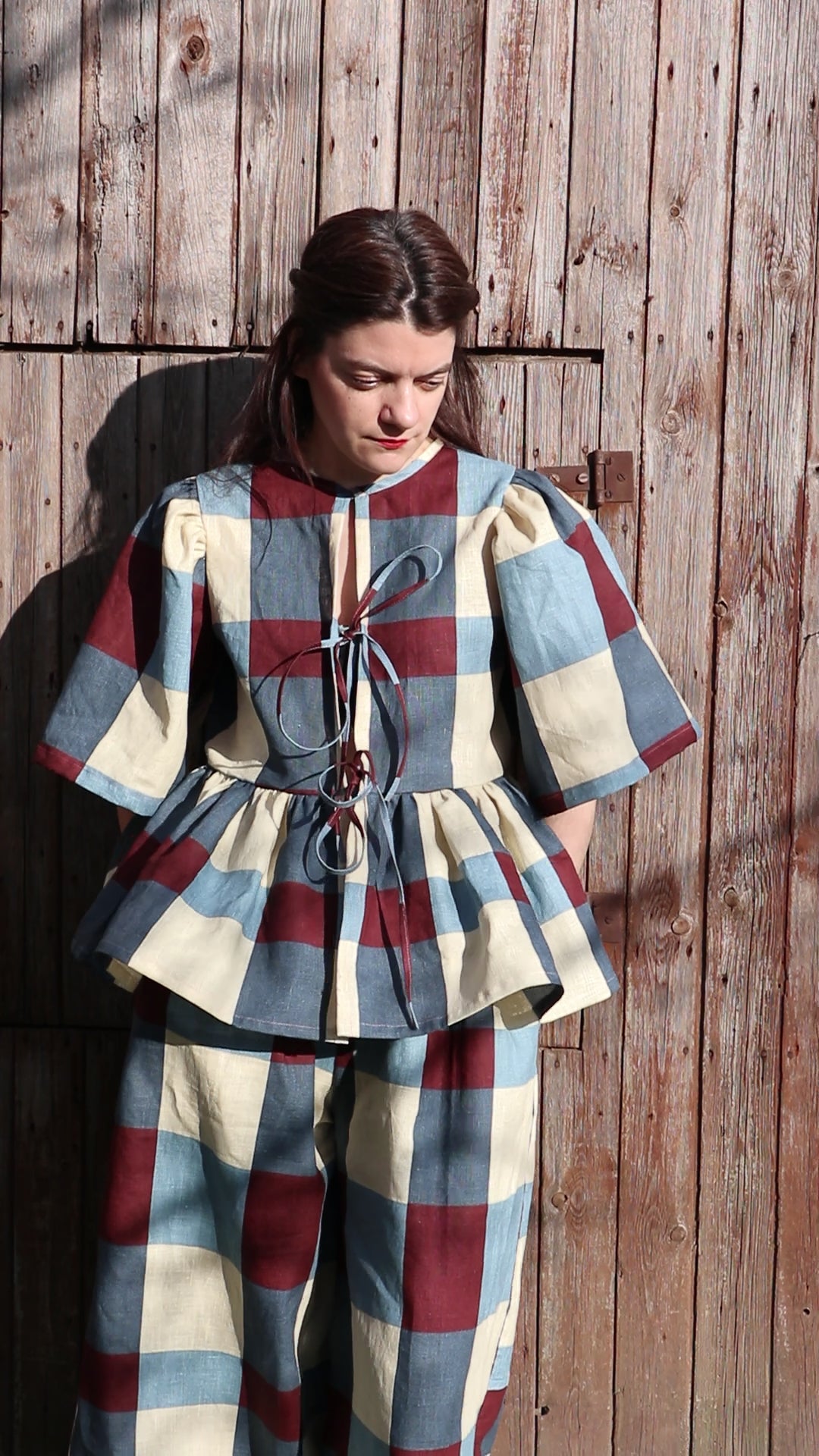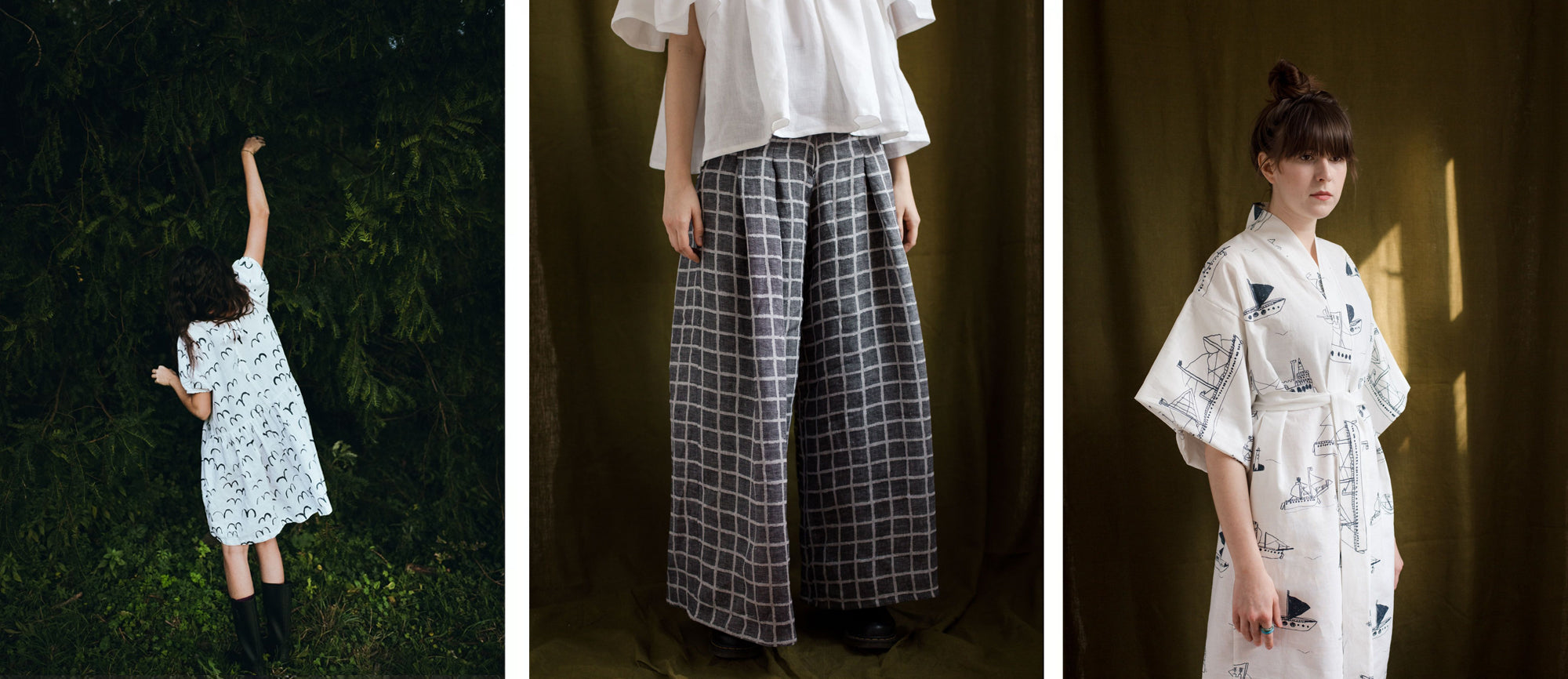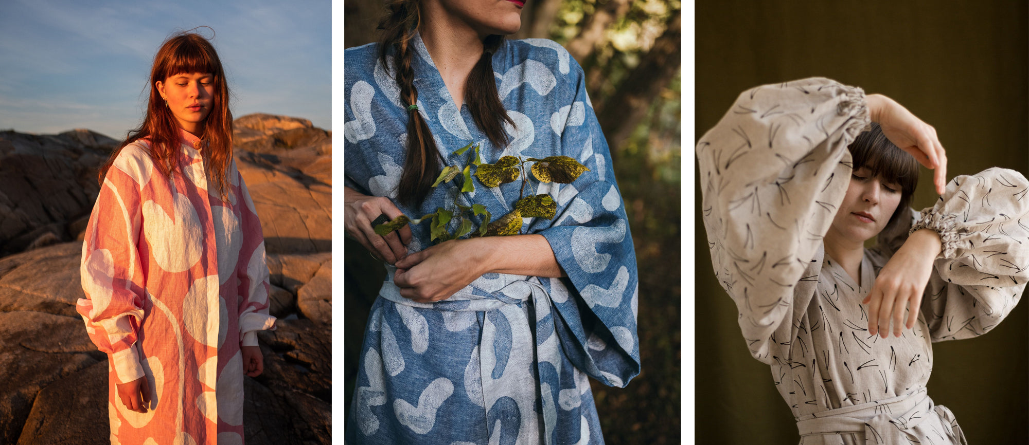 A: I Jag behöver trygghet i mitt arbete. En plats där jag känner mig hemma. Det är grunden för mig. Omgiven av vackra saker, trä, målningar och tyger. Min ateljé är just nu en sådan plats. Jag älskade vår verkstad i skolan. Inte på grund av utrustningen, utan för att vi alla satt vid ett stort bord. Var och en av oss arbetade med sitt terminsarbete och utöver arbetet kunde vi prata om vad som helst. Nu sköter jag dem helt tillsammans med illustratören Mária Nerádová, med vilken vi konsulterar varandras arbete. Men mitt arbetsflöde är alltid olika. När jag skapar ett nytt mönster börjar jag alltid med papper, akvarellfärger och en pensel. Jag älskar när det har en”icke-datoriserad” känsla. När jag arbetar med kläder skapar jag dem antingen i samråd med en annan person(det är viktigt för mig att förstå vad han eller hon gör för att skapa ett plagg som representerar hans eller hennes liv) eller så skapar jag dem så att jag personligen gillar dem och de baseras på vad jag faktiskt vill ha på mig. Mitt jobb är som ett pussel. Ibland är jag i min ateljé och vid symaskinen. När jag tvättar tyget, klipper mönstren och syr. Ibland sitter jag vid datorn och skriver till människor för att svara på deras meddelanden, ibland köper jag material och besöker sybehörsaffärer. När jag provar kläder, när jag lär någon att sy. I virrvarret av dessa aktiviteter tar jag mig dock tid att sy kläder som jag”tycker om att skapa”. Det är då jag återupplever känslan av att mitt jobb är min hobby och vice versa. De senaste månaderna har jag ägnat tid åt att förbereda kostymer för en teater. Det är ett helt annat sätt att arbeta och skapa på, och det stör systemet jag arbetat fram. Och ibland behöver jag sådana avbrott.